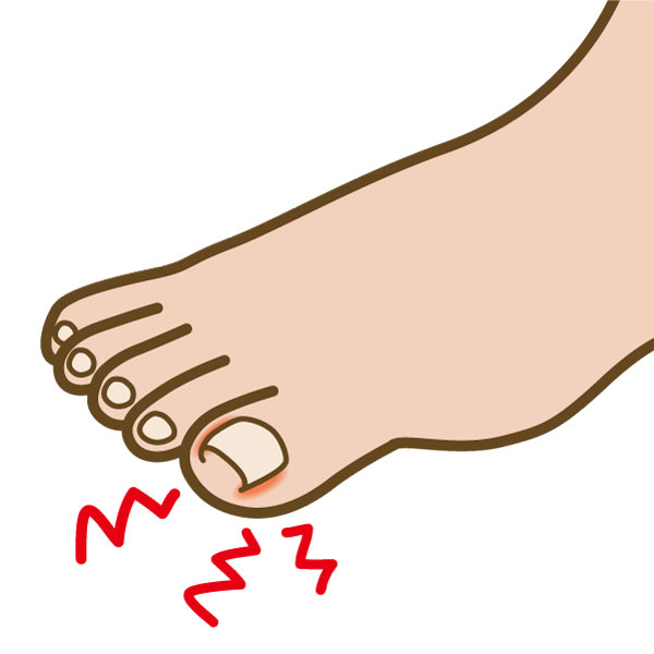 爪の端が皮膚に食い込んでいる状態です。食い込みが強いと腫れて赤くなり、化膿したり、肉芽ができることがあります。足の親指にできることが多く、靴による圧迫や深爪が原因になることがあります。靴のサイズ選択や爪の切り方に注意をすることで予防につながります。重症になると痛みで歩けなくなったりすることもあり、医療機関での治療を要する場合があります。テーピング法、コットン法の他に、自費にはなりますが爪矯正術を行うこともあります。