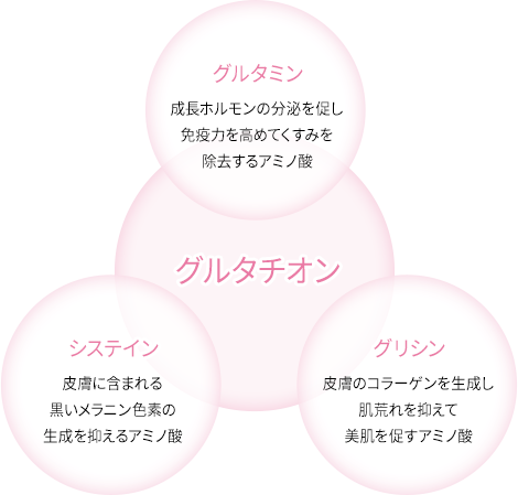グルタチオンは人間の体内に広く分布するアミノ酸が3つ結合したペプチドという化合物で、筋肉や肝臓に分布し強力な抗酸化作用があります。